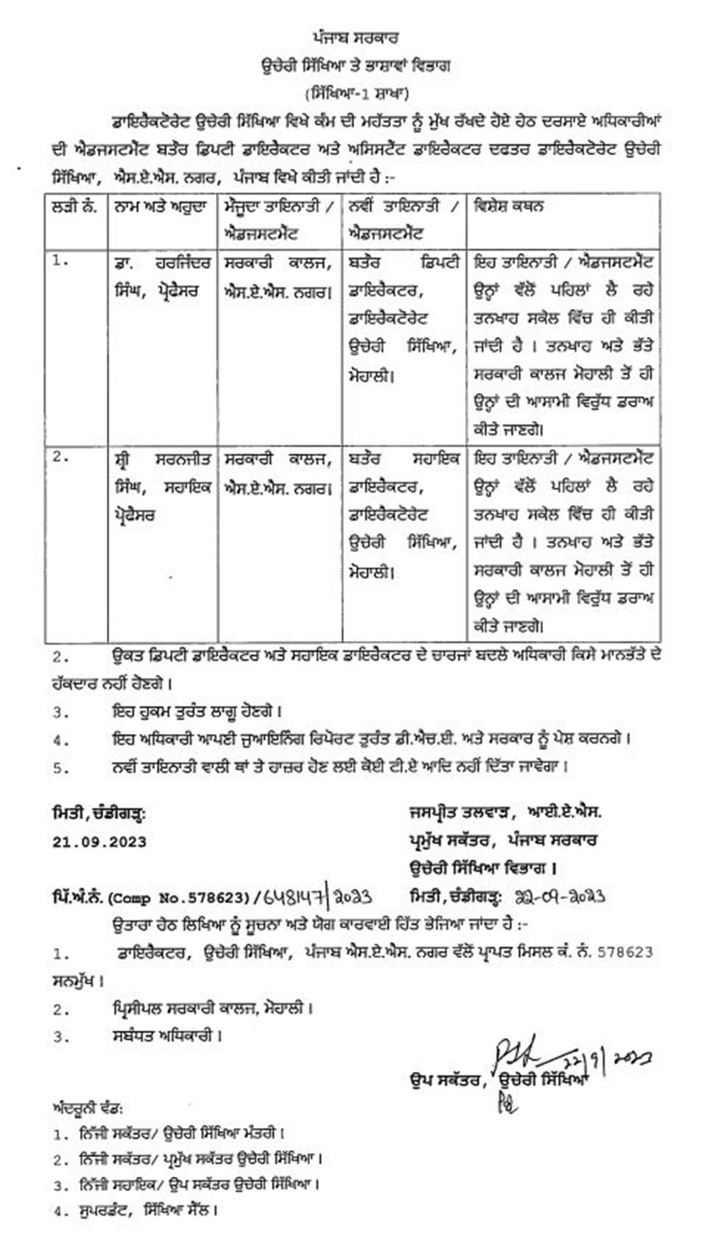 ਪੰਜਾਬ ਸਰਕਾਰ ਨੇ ਉਚੇਰੀ ਸਿੱਖਿਆ ਵਿਭਾਗ ’ਚ ਮੋਹਾਲੀ ਜ਼ਿਲ੍ਹੇ ਦੇ ਇਕ ਪ੍ਰੋਫੈਸਰ ਨੂੰ ਡਿਪਟੀ ਡਾਇਰੈਕਟਰ ਤੇ ਇਕ ਸਹਾਇਕ ਡਾਇਰੈਕਟਰ ਲਗਾਇਆ ਚੰਡੀਗੜ੍ਹ September 23, 2023September 23, 2023josh newsLeave a Comment on ਪੰਜਾਬ ਸਰਕਾਰ ਨੇ ਉਚੇਰੀ ਸਿੱਖਿਆ ਵਿਭਾਗ ’ਚ ਮੋਹਾਲੀ ਜ਼ਿਲ੍ਹੇ ਦੇ ਇਕ ਪ੍ਰੋਫੈਸਰ ਨੂੰ ਡਿਪਟੀ ਡਾਇਰੈਕਟਰ ਤੇ ਇਕ ਸਹਾਇਕ ਡਾਇਰੈਕਟਰ ਲਗਾਇਆ ਚੰਡੀਗੜ, ਗੁਰਦਾਸਪੁਰ, 23 ਸਤੰਬਰ (ਸਰਬਜੀਤ ਸਿੰਘ)– ਪੰਜਾਬ ਸਰਕਾਰ ਨੇ ਉਚੇਰੀ ਸਿੱਖਿਆ ਵਿਭਾਗ ’ਚ ਮੋਹਾਲੀ ਜ਼ਿਲ੍ਹੇ ਦੇ ਸਰਕਾਰੀ ਕਾਲਜ ਦੇ ਪ੍ਰੋਫੈਸਰ ਡਾ. ਹਰਜਿੰਦਰ ਸਿੰਘ ਨੂੰ ਡਿਪਟੀ ਡਾਇਰੈਕਟਰ ਅਤੇ ਸਰਨਜੀਤ ਸੰਘ ਸਹਾਇਕ ਪ੍ਰੋਫੈਸਰ ਨੂੰ ਸਹਾਇਕ ਡਾਇਰੈਕਟਰ ਲਗਾਇਆ ਹੈ।