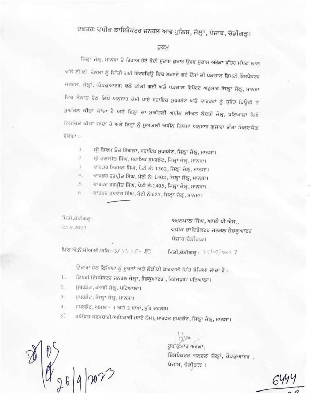 ਪੰਜਾਬ ਸਰਕਾਰ ਵੱਲੋਂ ਸਖਤ ਕਾਰਵਾਈ, ਇਕ ਜੇਲ੍ਹ ਦੇ 2 ਸਹਾਇਕ ਸੁਪਰਡੰਟ ਤੇ 4 ਵਾਰਡਰ ਕੀਤੇ ਮੁਅੱਤਲ ਚੰਡੀਗੜ੍ਹ September 27, 2023September 27, 2023josh newsLeave a Comment on ਪੰਜਾਬ ਸਰਕਾਰ ਵੱਲੋਂ ਸਖਤ ਕਾਰਵਾਈ, ਇਕ ਜੇਲ੍ਹ ਦੇ 2 ਸਹਾਇਕ ਸੁਪਰਡੰਟ ਤੇ 4 ਵਾਰਡਰ ਕੀਤੇ ਮੁਅੱਤਲ ਚੰਡੀਗੜ੍ਹ, ਗੁਰਦਾਸਪੁਰ, 27 ਸਤੰਬਰ (ਸਰਬਜੀਤ ਸਿੰਘ)– ਜ਼ਿਲ੍ਹਾ ਜੇਲ੍ਹ ਮਾਨਸਾ ਵਿੱਚ ਬੇਨਿਯਮਾਂ ਸਾਹਮਣੇ ਆਉਣ ਉਤੇ ਪੰਜਾਬ ਸਰਕਾਰ ਵੱਲੋਂ ਸਖਤ ਕਾਰਵਾਈ ਕੀਤੀ ਗਈ ਹੈ। ਸਰਕਾਰ ਨੇ 2 ਸਹਾਇਕ ਸੁਪਰਡੰਟਾਂ ਅਤੇ 4 ਵਾਰਡਰਾਂ ਨੂੰ ਮੁਅੱਤਲ ਕੀਤਾ ਹੈ।