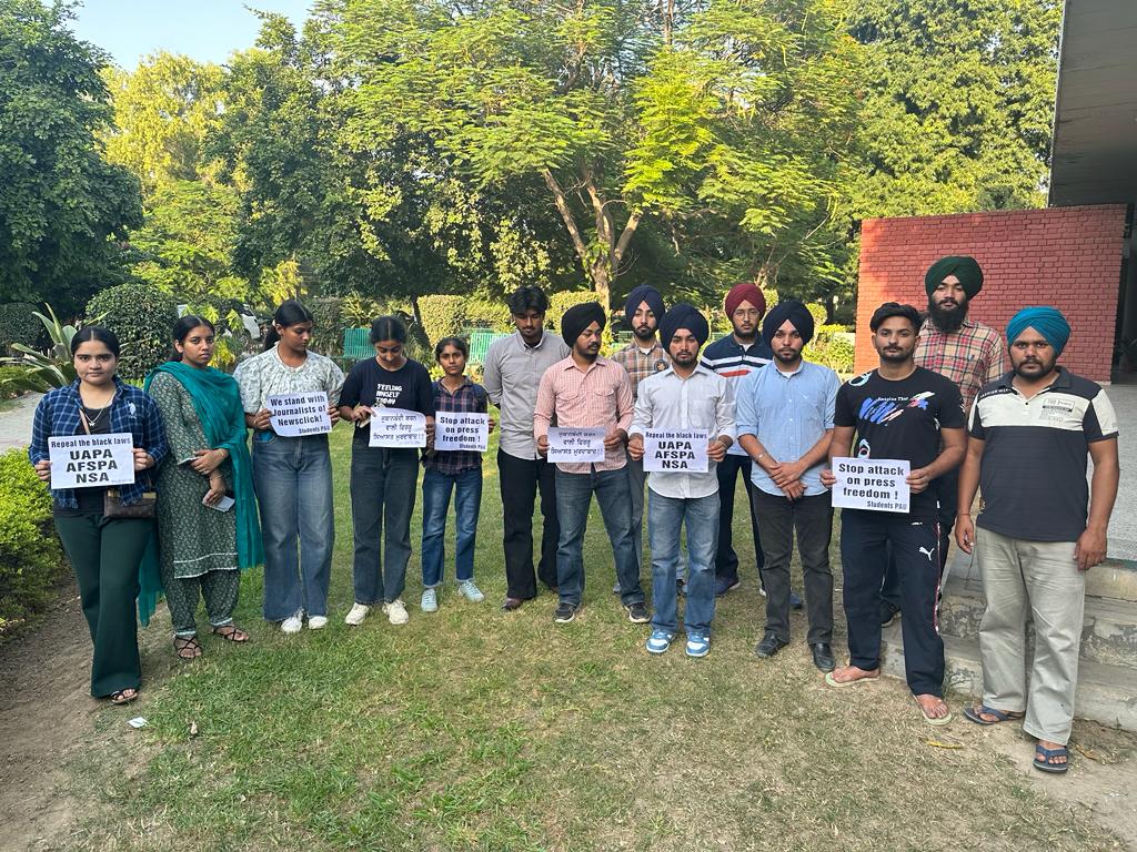 ਲੁਧਿਆਣਾ, ਗੁਰਦਾਸਪੁਰ 7 ਅਕਤੂਬਰ (ਸਰਬਜੀਤ ਸਿੰਘ)– ਪੰਜਾਬ ਖੇਤੀਬਾੜੀ ਯੂਨੀਵਰਸਿਟੀ ਲੁਧਿਆਣਾ ਵਿਖੇ ਵਿਦਿਆਰਥੀਆਂ ਵੱਲੋਂ ਅੱਜ ਵਿਦਿਆਰਥੀ ਭਵਨ ਦੇ ਬਾਹਰ ਇਕੱਠੇ ਹੋ ਕੇ ਦਿੱਲੀ ਦੇ ਨਿਊਜ਼ ਕਲਿੱਕ ਦੇ ਪੱਤਰਕਾਰਾਂ ਤੇ ਯੂ ਏ ਪੀ ਏ ਕਾਲੇ ਕਨੂੰਨ ਤਹਿਤ ਕੇਸ ਦਰਜ ਕਰਨ, ਗਿਰਫ਼ਤਾਰ ਕਰਨ ਅਤੇ ਓਹਨਾ ਦੇ ਘਰਾਂ, ਦਫਤਰਾਂ ਤੇ ਛਾਪੇਮਾਰੀ ਕਰਨ ਖਿਲਾਫ ਰੋਸ ਜਤਾਇਆ ਗਿਆ।