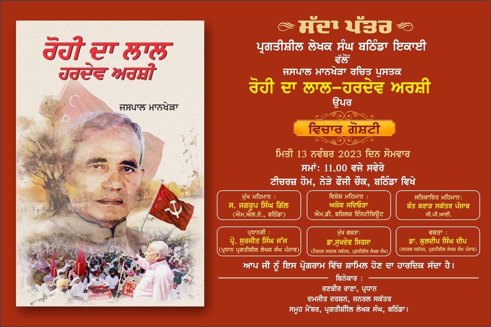 ਸੱਦਾ ਪੱਤਰ ਬਠਿੰਡਾ-ਮਾਨਸਾ November 11, 2023November 11, 2023josh newsLeave a Comment on ਸੱਦਾ ਪੱਤਰ ਬਠਿੰਡਾ,ਗੁਰਦਾਸਪੁਰ, 11 ਨਵੰਬਰ (ਸਰਬਜੀਤ ਸਿੰਘ)-ਰੋਹੀ ਦਾ ਲਾਲ ਹਰਦੇਵ ਅਰਸ਼ੀ ਉਪਰ ਵਿਚਾਰ ਗੋਸ਼ਟੀ 13 ਨਵੰਬਰ ਸਵੇਰੇ 11 ਵਜੇ ਟੀਚਰ ਹੋਮ ਨੇੜੇ ਫੌਜੀ ਚੌਂਕ ਬਠਿੰਡਾ ਵਿਖੇ ਮਨਾਈ ਜਾ ਰਹੀ ਹੈ। ਜਿਸ ਵਿੱਚ ਬੁੱਧੀਜੀਵੀਆਂ ਨੂੰ ਹੁੰਮਹਮਾ ਕੇ ਪਹੁੰਚਣ ਦੀ ਸੱਦਾ ਪੱਤਰ ਦਿੱਤਾ ਗਿਆ ਹੈ।