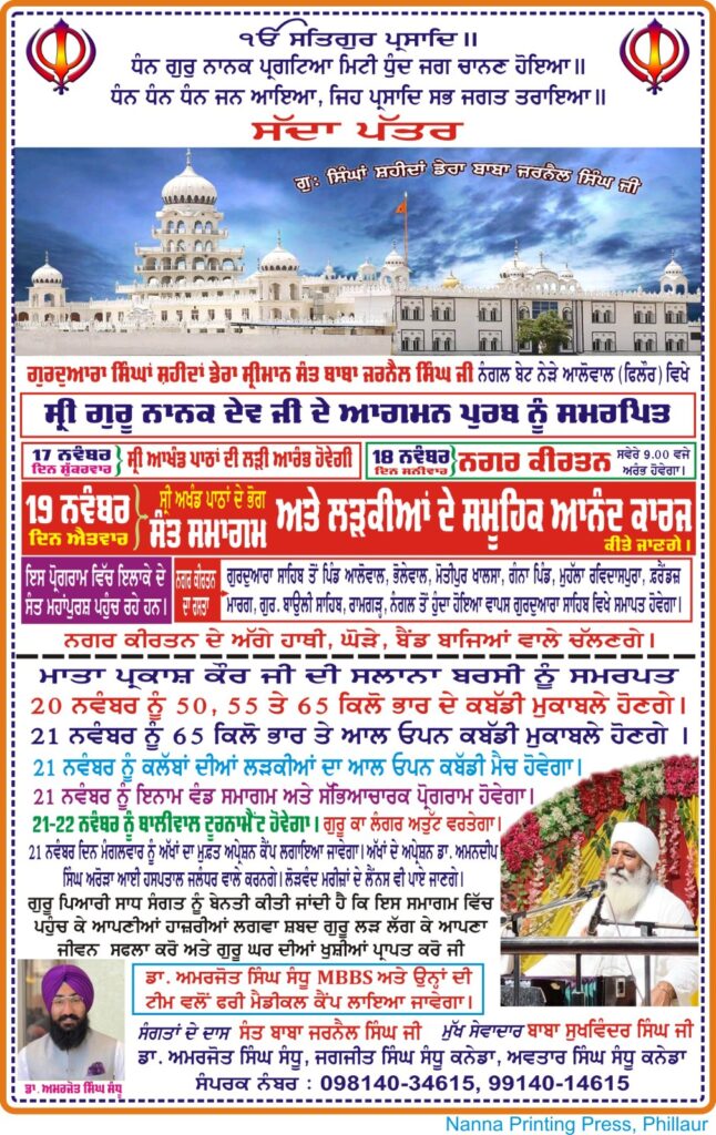 ਗੁਰਦਾਸਪੁਰ, 18 ਨਵੰਬਰ (ਸਰਬਜੀਤ ਸਿੰਘ)– ਗੁਰੂ ਨਾਨਕ ਪਾਤਸ਼ਾਹ ਜੀ ਦੇ ਆਗਮਨ ਦਿਵਸ ਅਤੇ ਸਵਰਗੀ ਮਾਤਾ ਪ੍ਰਕਾਸ਼ ਕੌਰ ਜੀ ਦੀ ਸਲਾਨਾ ਬਰਸੀ ਨੂੰ ਸਮਰਪਿਤ ਗੁਰਦੁਆਰਾ ਸਿੰਘਾਂ ਸ਼ਹੀਦਾਂ ਡੇਰਾ ਸੰਤ ਬਾਬਾ ਜਰਨੈਲ ਸਿੰਘ ਆਲੋਵਾਲ ਨੰਗਲ ਬੇਟ ਫਿਲੌਰ ਵਿਖੇ ਸਲਾਨਾ ਛੇ ਰੋਜ਼ਾ ਗੁਰਮਤਿ ਸਮਾਗਮ ਆਦਿ ਸ਼੍ਰੀ ਗੁਰੂ ਗ੍ਰੰਥ ਸਾਹਿਬ ਜੀ ਦੀ ਰਹਿਨੁਮਾਈ ਅਤੇ ਦੇਸ਼ਾਂ ਵਿਦੇਸ਼ਾਂ ਦੀਆਂ ਸੰਗਤਾਂ ਦੇ ਭਰਵੇਂ ਸਹਿਯੋਗ ਨਾਲ 22 ਨਵੰਬਰ ਤੱਕ ਬਹੁਤ ਸ਼ਰਧਾ ਭਾਵਨਾਵਾਂ ਤੇ ਚਾਵਾਂ ਨਾਲ ਮਨਾਇਆ ਜਾ ਰਿਹਾ ਅਖੰਡ ਪਾਠਾਂ ਦੇ ਲੜੀਵਾਰ ਭੋਗ ਪਾਏ ਜਾਣਗੇ,ਨਗਰ ਕੀਰਤਨ ਸਜਾਇਆ ਜਾਵੇਗਾ , 21 ਗਰੀਬ ਲੜਕੀਆਂ ਦੇ ਅਨੰਦ ਕਾਰਜ ਤੇ ਧਾਰਮਿਕ ਦੀਵਾਨ ਸਜਾਇਆ ਜਾਵੇਗਾ, ਆਏਂ ਸੰਤਾਂ ਮਹਾਪੁਰਸ਼ਾਂ, ਧਾਰਮਿਕ ਬੁਲਾਰਿਆਂ ਤੇ ਹੋਰ ਪਤਵੰਤਿਆਂ ਨੂੰ ਮੁੱਖ ਪ੍ਰਬੰਧਕ ਸੰਤ ਬਾਬਾ ਸੁਖਵਿੰਦਰ ਸਿੰਘ ਜੀ, ਸਰਪ੍ਰਸਤ ਸੰਤ ਮਹਾਂਪੁਰਸ਼ ਬਾਬਾ ਜਰਨੈਲ ਸਿੰਘ , ਸ੍ਰ ਗਰੇਵਾਲ ਲੁਧਿਆਣਾ, ਡਾਕਟਰ ਅਮਰਜੋਤ ਸਿੰਘ ਸੰਧੂ ਤੇ ਭਾਈ ਵਿਰਸਾ ਸਿੰਘ ਖਾਲਸਾ ਪ੍ਰਧਾਨ ਏ ਆਈ ਐਸ ਐਸ ਐਫ ਵੱਲੋਂ ਸਨਮਾਨ ਕੀਤਾ ਜਾਵੇਗਾ, ਗੁਰੂ ਕੇ ਲੰਗਰ ਅਟੁੱਟ ਵਰਤਾਏ ਜਾਣਗੇ ਇਸ ਸਬੰਧੀ ਪ੍ਰੈਸ ਨੂੰ ਮੁਕੰਮਲ ਜਾਣਕਾਰੀ ਆਲ ਇੰਡੀਆ ਸਿੱਖ ਸਟੂਡੈਂਟਸ ਫੈਡਰੇਸ਼ਨ ਖਾਲਸਾ ਦੇ ਕੌਮੀ ਪ੍ਰਧਾਨ ਭਾਈ ਵਿਰਸਾ ਸਿੰਘ ਖਾਲਸਾ ਨੇ ਇਕ ਲਿਖਤੀ ਪ੍ਰੈਸ ਬਿਆਨ ਰਾਹੀਂ ਦਿੱਤੀ ਉਹਨਾਂ ਦਸਿਆ ਗੁਰਮਤਿ ਸਮਾਗਮ ਦੇ ਸਬੰਧ ਵਿੱਚ ਅੱਜ 21 ਲੜੀਵਾਰ ਅਖੰਡ ਪਾਠ,ਦੋ ਸੰਪਟ ਸਮੇਤ ਜਪੁਜੀ ਸਾਹਿਬ ਟੋਟਲ 24 ਅਖੰਡ ਪਾਠਾਂ ਦੇ ਪਾਠ ਅਰੰਭ ਕਰ ਦਿੱਤਾ ਗਏ ਹਨ ਅਤੇ ਕੱਲ 18 ਨਵੰਬਰ ਨੂੰ ਆਦਿ ਸ਼੍ਰੀ ਗੁਰੂ ਗ੍ਰੰਥ ਸਾਹਿਬ ਜੀ ਦੀ ਰਹਿਨੁਮਾਈ ਅਤੇ ਪੰਜ ਪਿਆਰਿਆਂ ਦੀ ਅਗਵਾਈ ਹੇਠ ਇੱਕ ਸ਼ਾਨਦਾਰ ਨਗਰ ਕੀਰਤਨ ਹਾਥੇ ਘੋੜੇ ਤੇ ਬੈਂਡ ਵਾਜਿਆਂ ਸਮੇਤ ਸ਼ੇਰੇ ਪੰਜਾਬ ਗਤਕਾ ਅਖਾੜਾ ਜਥੇਦਾਰ ਦਲਬੀਰ ਦੀ ਟੀਮ ਨਾਲ ਗੁਰਦੁਆਰਾ ਸਿੰਘਾਂ ਸ਼ਹੀਦਾਂ ਡੇਰਾ ਸੰਤ ਬਾਬਾ ਜਰਨੈਲ ਸਿੰਘ ਆਲੋਵਾਲ ਨੰਗਲ ਬੇਟ ਤੋਂ ਸਵੇਰੇ 10 ਵਜੇ ਰਵਾਨਾ ਹੋਵੇਗਾ, ਜੋਂ ਸਮੂਹ ਫਿਲੌਰ ਨੰਗਲ ਦੇ ਗੁਰੂ ਘਰਾਂ’ਚ ਨਕਮਸਤਕ ਹੁੰਦਾ ਹੋਇਆ ਵਾਪਸ ਸਿੰਘਾਂ ਸ਼ਹੀਦਾਂ ਅਲੋਵਾਲ ਪਹੁੰਚੇਗਾ, ਭਾਈ ਖਾਲਸਾ ਨੇ ਦੱਸਿਆ 19 ਨਵੰਬਰ ਨੂੰ ਅਖੰਡ ਪਾਠਾਂ ਦੇ ਭੋਗਾਂ ਤੋਂ ਉਪਰੰਤ ਲੜਕੀਆਂ ਦੇ ਅਨੰਦ ਕਾਰਜ ਹਰਮੰਦਰ ਸਾਹਿਬ ਦਾ ਕੀਰਤਨੀ ਜਥਾ ਕਰਵਾਏਗਾ ਅਤੇ ਧਾਰਮਿਕ ਦੀਵਾਨ ਸਜਾਏ ਜਾਣਗੇ ਜਿਸ ਵਿੱਚ ਪੰਥ ਦੇ ਮਹਾਨ ਧਾਰਮਿਕ ਬੁਲਾਰੇ ਹਾਜ਼ਰੀ ਭਰਨਗੇ,20 ਨਵੰਬਰ ਨੂੰ ਪੇਂਡੂ ਖੇਡ ਮੇਲਾ ਤੇ ਕਬੱਡੀ ਵਾਲੀਬਾਲ ਟੂਰਨਾਮੈਂਟ ਕਰਵਾਏ ਜਾਣਗੇ ਤੇ ਜੇਤੂਆਂ ਨੂੰ ਇਨਾਮ ਤਕਸੀਮ ਕੀਤੇ ਜਾਣਗੇ,ਭਾਈ ਖਾਲਸਾ ਨੇ ਦੱਸਿਆ 21 ਨਵੰਬਰ ਛੇਵੇਂ ਤੇ ਆਖਰੀ ਦਿਨ ਡਾਕਟਰ ਅਮਰਜੋਤ ਸਿੰਘ ਸੰਧੂ ਤੇ ਉਹਨਾਂ ਦੀ ਟੀਮ ਵੱਲੋਂ ਅੱਖਾਂ ਦਾ ਮੁਫ਼ਤ ਕੈਂਪ ਲਗਾਇਆ ਜਾਵੇਗਾ ਅਤੇ ਐਨਕਾਂ ਲੈਨਜ ਓਪਰੇਸ਼ਨ ਫ੍ਰੀ ਕੀਤੇ ਜਾਣਗੇ, ਗੁਰੂ ਕੇ ਲੰਗਰ ਬੀਬੀ ਕਰਮਜੀਤ ਕੌਰ ਸੰਧੂ ਤੇ ਉਹਨਾਂ ਦੀ ਟੀਮ ਵੱਲੋਂ ਦਿੱਨ ਰਾਤ ਲਗਾਤਾਰ ਅਟੁੱਟ ਵਰਤਾਏ ਜਾਣਗੇ, ਭਾਈ ਖਾਲਸਾ ਨੇ ਦੱਸਿਆ ਇਹਨਾਂ ਸਮਾਗਮਾਂ ਵਿੱਚ ਸਮੂਹ ਸੰਗਤਾਂ ਨੂੰ ਸੱਦਾ ਪੱਤਰ ਦਿਤਾ ਜਾਂਦਾ ਹੈ ਕਿ ਉਹ ਹਾਜ਼ਰੀਆਂ ਭਰ ਕੇ ਆਪਣਾ ਮਨੁੱਖੀ ਜੀਵਨ ਸਫਲ ਬਣਾਉਣ ਦੀ ਲੋੜ ਤੇ ਜ਼ੋਰ ਦੇਣ, ਇਹ ਅਸਥਾਨ ਫਿਲੌਰ ਤੋਂ ਸਿਰਫ ਇੱਕ ਕਿਲੋਮੀਟਰ ਦੀ ਦੂਰੀ ਪਿੰਡ ਆਲੋਵਾਲ ਵਿਖੇ ਸਥਿਤ ਹੈ ।