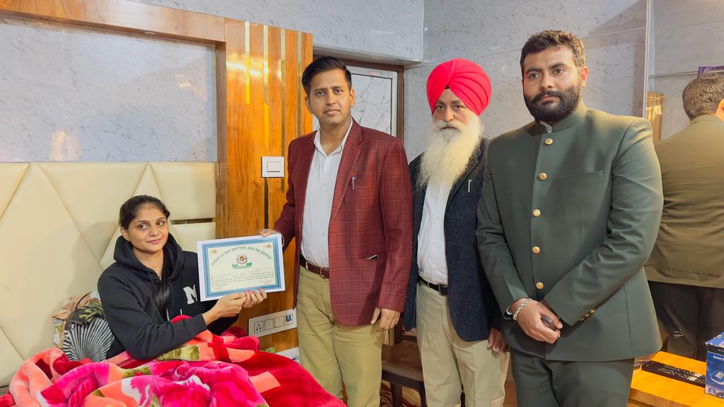 ਗੁਰਦਾਸਪੁਰ, 10 ਦਸੰਬਰ (ਸਰਬਜੀਤ ਸਿੰਘ)– ਡਿਪਟੀ ਕਮਿਸ਼ਨਰ ਡਾ. ਹਿਮਾਂਸ਼ੂ ਅਗਰਵਾਲ ਵੱਲੋਂ ਅੱਜ ਖੇਤੀਬਾੜੀ ਵਿਭਾਗ ਦੀ ਅਧਿਕਾਰੀ ਖੇਤੀ ਵਿਸਥਾਰ ਅਫ਼ਸਰ ਅਮਨਦੀਪ ਕੌਰ ਦੇ ਘਰ ਜਾ ਕੇ ਉਸਦੀ ਸਿਹਤ ਦਾ ਹਾਲ ਜਾਣਿਆ ਹੈ ਅਤੇ ਨਾਲ ਹੀ ਉਸਨੂੰ ਵਧੀਆ ਸੇਵਾਵਾਂ ਲਈ ਵਿਸ਼ੇਸ਼ ਤੌਰ ’ਤੇ ਸਨਮਾਨਿਤ ਕੀਤਾ ਹੈ।