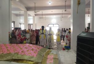 ਗੁਰਦੁਆਰਾ ਸਿੰਘਾਂ ਸ਼ਹੀਦਾਂ ਡੇਰਾ ਸੰਤ ਬਾਬਾ ਜਰਨੈਲ ਸਿੰਘ ਮੈਨੀਆ ਬੰਬ ਨਗਰ ਯੂ ਪੀ ਵਿਖੇ ਦਸਵੇਂ ਪਾਤਸ਼ਾਹ ਸ੍ਰੀ ਗੁਰੂ ਗੋਬਿੰਦ ਸਿੰਘ ਜੀ ਦੇ ਪ੍ਰਕਾਸ਼ ਦਿਹਾੜੇ ਨੂੰ ਸਮਰਪਿਤ ਸਜਾਏ ਗਏ ਸ਼ਾਨਦਾਰ ਨਗਰ ਕੀਰਤਨ ਦੀ ਅਰੰਭਤਾ ਮੋਕੇ ਅਰਦਾਸ ਕਰਦੇ ਮੁੱਖ ਪ੍ਰਬੰਧਕ ਅਤੇ ਸੰਤ ਸਮਾਜ ਦੇ ਮੁੱਖ ਬੁਲਾਰੇ ਸੰਤ ਬਾਬਾ ਸੁਖਵਿੰਦਰ ਸਿੰਘ ਆਲੋਵਾਲ ਨੰਗਲ ਬੇਟ ਫਿਲੌਰ ਅਰਦਾਸ ਕਰਦੇ ਹੋਏ ਅਤੇ ਪੰਜ ਪਿਆਰੇ ਸਮੇਤ ਸੈਂਕੜੇ ਸੰਗਤਾਂ