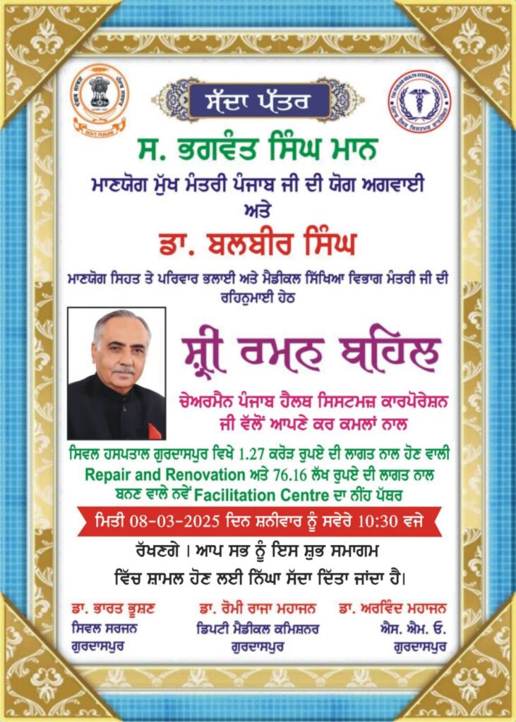 ਚੇਅਰਮੈਨ ਰਮਨ ਬਹਿਲ ਵੱਲੋਂ 8 ਮਾਰਚ 2025 ਨੂੰ ਸਵੇਰੇ 10:30 ਵਜੇ ਸਿਵਲ ਹਸਪਤਾਲ ਗੁਰਦਾਸਪੁਰ ਵਿਖੇ ਨਵੇਂ ਫੈਸਲੀਟੇਸ਼ਨ ਸੈਂਟਰ ਦਾ ਰੱਖਿਆ ਜਾਵੇਗਾ ਨੀਂਹ ਪੱਥਰ