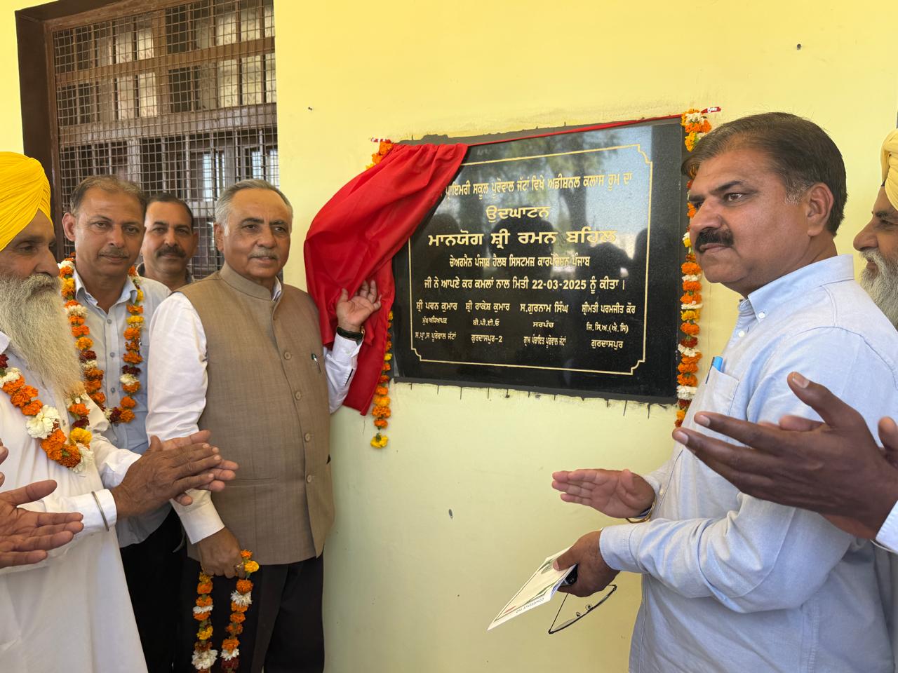 ਗੁਰਦਾਸਪੁਰ, 22 ਮਾਰਚ (ਸਰਬਜੀਤ ਸਿੰਘ) – ਪੰਜਾਬ ਹੈਲਥ ਸਿਸਟਮਜ਼ ਕਾਰਪੋਰੇਸ਼ਨ ਦੇ ਚੇਅਰਮੈਨ ਰਮਨ ਬਹਿਲ ਵੱਲੋਂ ਅੱਜ ਸਰਕਾਰੀ ਹਾਈ ਸਮਾਰਟ ਸਕੂਲ ਪੂਰੋਵਾਲ ਜੱਟਾਂ ਵਿਖੇ 15 ਲੱਖ ਰੁਪਏ ਦੀ ਲਾਗਤ ਨਾਲ ਬਣੇ ਐਡੀਸ਼ਨਲ ਕਲਾਸ ਰੂਮ ਦਾ ਉਦਘਾਟਨ ਕੀਤਾ ਗਿਆ। ਇਸ ਮੌਕੇ ਉਨ੍ਹਾਂ ਨਾਲ ਇਰਾ ਮੁੱਖ ਅਧਿਆਪਕ, ਸਰਕਾਰੀ ਹਾਈ ਸਮਾਰਟ ਸਕੂਲ ਪੂਰੋਵਾਲ ਜੱਟਾਂ, ਸਰਪੰਚ ਗੁਰਨਾਮ ਸਿੰਘ ਪੂਰੋਵਾਲ ਜੱਟਾਂ ਅਤੇ ਸਕੂਲ ਦਾ ਸਟਾਫ਼ ਅਤੇ ਵਿਦਿਆਰਥੀਆਂ ਦੇ ਮਾਪੇ ਵੀ ਹਾਜ਼ਰ ਸਨ।
