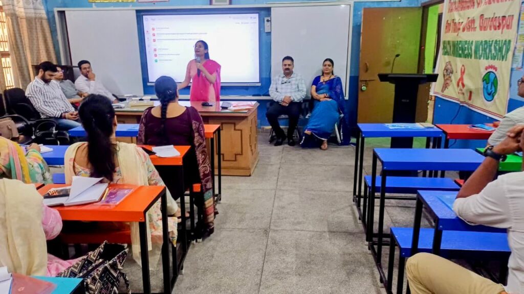 ਗੁਰਦਾਸਪੁਰ 19 ਸਤੰਬਰ (ਸਰਬਜੀਤ ਸਿੰਘ)– ਡਾਇਰੈਕਟਰ ਐਸ.ਟੀ.ਆਰ.ਟੀ.ਪੰਜਾਬ ਦੇ ਦਿਸ਼ਾ ਨਿਰਦੇਸ਼ਾਂ ਤੇ ਪ੍ਰਿੰਸੀਪਲ ਹਰਿੰਦਰ ਸਿੰਘ ਸੈਣੀ ਦੀ ਅਗਵਾਈ ਹੇਠ ਜ਼ਿਲ੍ਹਾ ਸਿੱਖਿਆ ਤੇ ਸਿਖਲਾਈ ਸੰਸਥਾ ਗੁਰਦਾਸਪੁਰ ਵਿਖੇ ਜ਼ਿਲ੍ਹੇ ਦੇ ਪ੍ਰਾਈਵੇਟ ਸਕੂਲਾਂ ਦੇ ਅਧਿਆਪਕਾਂ ਦੀ ਸਿਹਤ ਜਾਗਰੂਕਤਾ ਸਬੰਧੀ ਵਰਕਸ਼ਾਪ ਆਯੋਜਿਤ ਕੀਤੀ ਗਈ। ਇਸ ਦੌਰਾਨ ਜਾਣਕਾਰੀ ਦਿੰਦੇ ਹੋਏ ਲੈਕਚਰਾਰ ਡਾਇਟ ਨਰੇਸ਼ ਕੁਮਾਰ ਨੇ ਦੱਸਿਆ ਕਿ ਸਕੂਲ ਹੈੱਲਥ ਪ੍ਰੋਗਰਾਮ ਦੇ ਥੀਮ ਤੇ ਪ੍ਰਾਈਵੇਟ ਸਕੂਲਾਂ ਦੇ ਅਧਿਆਪਕਾਂ ਦੀ ਇੱਕ ਰੋਜ਼ਾ ਵਰਕਸ਼ਾਪ ਕਰਵਾਈ ਗਈ ਜਿਸ ਵਿੱਚ ਡਾ. ਸੁਮਿਤ ਸੈਣੀ, ਡਾ. ਮੀਰਾ ਕੌਸ਼ਲ, ਡਾ. ਸੁਚੇਤਨ ਅਬਰੋਲ, ਡਾ. ਅਨੁਪ੍ਰਿਆ ਵੱਲੋਂ ਸਕੂਲ ਹੈੱਲਥ ਐਂਡ ਵੈਲਨੈਸ, ਏਡਸ ਪ੍ਰਤੀ ਜਾਗਰੂਕਤਾ, ਮਾਹਵਾਰੀ ਸਬੰਧੀ ਜਾਗਰੂਕਤਾ, ਕਿਸ਼ੋਰ ਸਿੱਖਿਆ ਆਦਿ ਸਬੰਧੀ ਵਿਸਥਾਰ ਪੂਰਵਕ ਜਾਣਕਾਰੀ ਦਿੱਤੀ। ਇਸ ਮੌਕੇ ਸਟੇਜ ਸੈਕਟਰੀ ਦੀ ਭੂਮਿਕਾ ਵੰਦਨਾ ਗੁਪਤਾ ਨੇ ਨਿਭਾਈ। ਇਸ ਮੌਕੇ ਲੈਕਚਰਾਰ ਤਰਨਜੋਤ ਕੌਰ , ਲੈਕਚਰਾਰ ਸ਼ਸ਼ੀ ਭੂਸ਼ਨ, ਸਰੋਜ ਸ਼ਰਮਾ , ਪੰਕਜ ਸ਼ਰਮਾ, ਸਰਿਤਾ ਗੁਪਤਾ ਤੇ ਕਲਰਕ ਰਾਜੇਸ਼ ਕੁਮਾਰ ਹਾਜ਼ਰ ਸਨ।