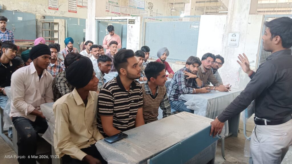 ਬੁਢਲਾਡਾ, ਗੁਰਦਾਸਪੁਰ, 6 ਮਾਰਚ (ਸਰਬਜੀਤ ਸਿੰਘ)— 23 ਮਾਰਚ 2026 ਸ਼ਹੀਦ-ਏ-ਆਜ਼ਮ ਭਗਤ ਸਿੰਘ,ਰਾਜਗੁਰੂ ਅਤੇ ਸੁਖਦੇਵ ਦੇ ਸ਼ਹੀਦੀ ਦਿਹਾੜੇ ਮੌਕੇ ਕਰਵਾਈ ਜਾ ਰਹੀ ਵਿਦਿਆਰਥੀ-ਨੌਜਵਾਨ ਕਨਵੈਂਸ਼ਨ ਦੀ ਤਿਆਰੀ ਵਜੋਂ ਸਰਕਾਰੀ ਆਈ ਟੀ ਆਈ ਬੁਢਲਾਡਾ ਅਤੇ ਗੁਰੂ ਨਾਨਕ ਕਾਲਜ ਬੁਢਲਾਡਾ ਵਿਖੇ ਆਲ ਇੰਡੀਆ ਸਟੂਡੈਂਟਸ ਐਸੋਸੀਏਸ਼ਨ (ਆਇਸਾ) ਅਤੇ ਇਨਕਲਾਬੀ ਨੌਜਵਾਨ ਸਭਾ ਪੰਜਾਬ ਵੱਲੋਂ ਮੀਟਿੰਗ ਕਰਵਾਈ ਗਈ।