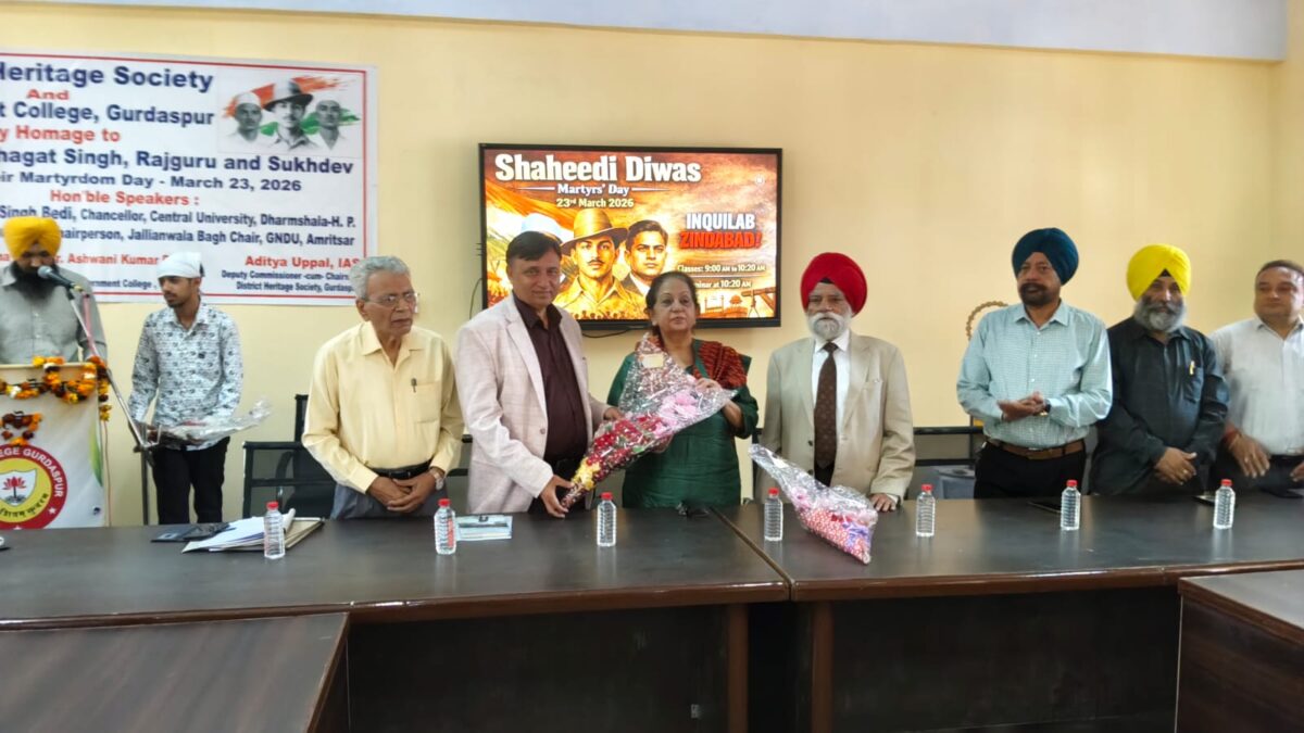 ਗੁਰਦਾਸਪੁਰ, 23 ਮਾਰਚ (ਸਰਬਜੀਤ ਸਿੰਘ)– ਸਰਕਾਰੀ ਕਾਲਜ ਗੁਰਦਾਸਪੁਰ ਵੱਲੋਂ ਅੱਜ ਸ਼ਹੀਦੇ ਆਜ਼ਮ ਭਗਤ ਸਿੰਘ, ਰਾਜਗੁਰੂ ਅਤੇ ਸੁਖਦੇਵ ਦੇ ਸ਼ਹੀਦੀ ਦਿਵਸ ਨੂੰ ਬੜੀ ਸ਼ਰਧਾ ਅਤੇ ਦੇਸ਼ਭਗਤੀ ਭਾਵਨਾ ਨਾਲ ਮਨਾਇਆ ਗਿਆ। ਇਸ ਸਮਾਗਮ ਦਾ ਆਯੋਜਨ ਜ਼ਿਲ੍ਹਾ ਹੈਰੀਟੇਜ ਸੋਸਾਇਟੀ ਗੁਰਦਾਸਪੁਰ ਜਿਸ ਦੇ ਪ੍ਰਧਾਨ ਡਿਪਟੀ ਕਮਿਸ਼ਨਰ ਗੁਰਦਾਸਪੁਰ ਅਤੇ ਸਕੱਤਰ ਪ੍ਰੋ. ਰਾਜ ਕੁਮਾਰ ਸ਼ਰਮਾ ਹਨ ਦੇ ਸਹਿਯੋਗ ਨਾਲ ਸਰਕਾਰੀ ਕਾਲਜ ਗੁਰਦਾਸਪੁਰ ਦੇ ਪ੍ਰੰਗਣ ਵਿੱਚ ਕੀਤਾ ਗਿਆ। ਇਸ ਮੌਕੇ ਜ਼ਿਲ੍ਹਾ ਹੈਰਿਟੇਜ ਸੋਸਾਇਟੀ ਦੇ ਮੈਂਬਰ ਸਾਹਿਬਾਨ ਵੀ ਵਿਸ਼ੇਸ਼ ਤੌਰ ‘ਤੇ ਹਾਜ਼ਰ ਰਹੇ।