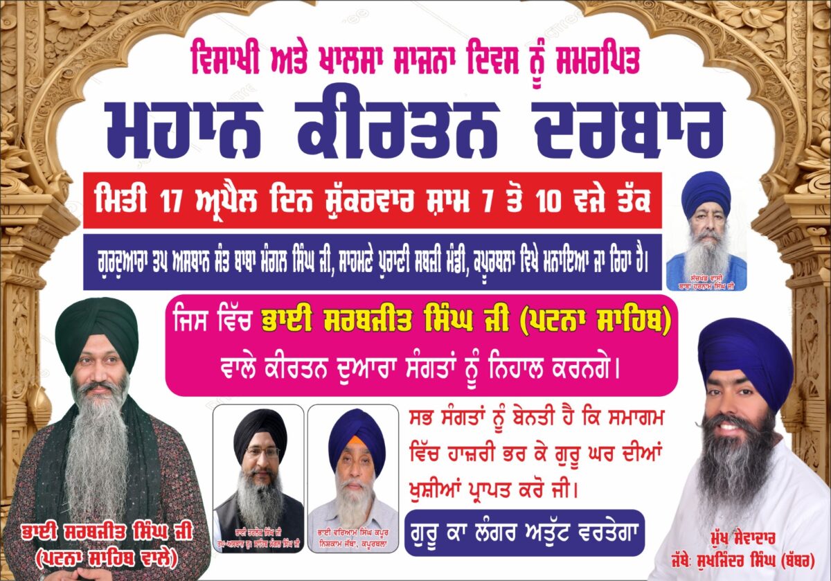 ਕਪੂਰਥਲਾ, ਗੁਰਦਾਸਪੁਰ, 16 ਅਪ੍ਰੈਲ (ਸਰਬਜੀਤ ਸਿੰਘ)– ਖਾਲਸਾ ਸਾਜਣਾ ਦਿਵਸ ਨੂੰ ਸਮਰਪਿਤ ਇਕ ਵੱਡਾ ਗੁਰਮਤਿ ਸਮਾਗਮ ਬਹੁਤ ਹੀ ਸ਼ਰਧਾ ਭਾਵਨਾਵਾਂ ਤੇ ਉਤਸ਼ਾਹ ਨਾਲ ਆਦਿ ਗੁਰੂ ਗ੍ਰੰਥ ਸਾਹਿਬ ਜੀ ਦੀ ਛਤਰ ਛਾਇਆ ਹੇਠ ਅਤੇ ਮੁੱਖ ਪ੍ਰਬੰਧਕ ਸਿੰਘ ਸਾਹਿਬ ਬਾਬਾ ਕੁਲਵਿੰਦਰ ਸਿੰਘ ਬੱਬਰ ਦੀ ਦੇਖ ਰੇਖ ਹੇਠ’ਚ ਬਹੁਤ ਹੀ ਸ਼ਰਧਾ ਭਾਵਨਾਵਾਂ ਤੇ ਉਤਸ਼ਾਹ ਨਾਲ ਮਨਾਇਆ ਜਾ ਰਿਹੈ ਹੈ ਜਿਸ ਵਿਚ ਨਾਮਵਰ ਰਾਗੀ ਢਾਡੀ ਕਵੀਸ਼ਰ ਪ੍ਰਚਾਰਕ ਅਤੇ ਸੰਤ ਮਹਾਂਪੁਰਸ਼ ਵੱਡੀ ਗਿਣਤੀ ਵਿਚ ਪਹੁੰਚ ਰਹੇ ਗੁਰਮਤਿ ਸਮਾਗਮ ਦੀ ਆਰੰਭਤਾ ਰੱਖੇ ਅਖੰਡਪਾਠਾਂ ਦੇ ਭੋਗ ਤੋਂ ਉਪਰੰਤ ਕੀਤਾ ਜਾਵੇ,ਸਮੂਹ ਧਾਰਮਿਕ ਬੁਲਾਰਿਆਂ ਦਾ ਸਨਮਾਨ ਕੀਤਾ ਜਾਵੇਗਾ ਅਤੇ ਗੁਰੂ ਕੇ ਲੰਗਰ ਅਟੁੱਟ ਵਰਤਾਏ ਜਾਣਗੇ, ਇਸ ਸਬੰਧੀ ਪ੍ਰੈਸ ਨੂੰ ਜਾਣਕਾਰੀ ਆਲ ਇੰਡੀਆ ਸਿੱਖ ਸਟੂਡੈਂਟਸ ਫੈਡਰੇਸ਼ਨ ਖਾਲਸਾ ਦੇ ਕੌਮੀ ਪ੍ਰਧਾਨ ਭਾਈ ਵਿਰਸਾ ਸਿੰਘ ਖਾਲਸਾ ਨੇ ਮੁੱਖ ਪ੍ਰਬੰਧਕ ਭਾਈ ਬੱਬਰ ਨਾਲ਼ ਗੱਲਬਾਤ ਕਰਨ ਤੋਂ ਉਪਰੰਤ ਇੱਕ ਲਿਖਤੀ ਪ੍ਰੈਸ ਬਿਆਨ ਰਾਹੀਂ ਦਿੱਤੀ, ਉਹਨਾਂ ਦੱਸਿਆ ਸਮਾਗਮ ਸਬੰਧੀ ਗੁਰਦੁਆਰਾ ਸਾਹਿਬ ਵਿਖੇ ਰੱਬੀ ਗੁਰਬਾਣੀ ਦੇ ਅਖੰਡਪਾਠ ਸਾਹਿਬ 15 ਅਪ੍ਰੈਲ ਨੂੰ ਆਰੰਭ ਕੀਤੇ ਗਏ ਹਨ ਜਿਨ੍ਹਾਂ ਦੇ ਸੰਪੂਰਨ ਭੋਗ ਤੋਂ ਉਪਰੰਤ ਖਾਲਸਾ ਸਾਜਨਾ ਦਿਵਸ ਸਬੰਧੀ ਗੁਰਮਤਿ ਸਮਾਗਮ ਦੀ ਆਰੰਭਤਾ ਹੋਏ ਗੀ ਅਤੇ ਵੱਖ ਵੱਖ ਧਾਰਮਿਕ ਹਾਜ਼ਰ ਲਵਾਕੇ ਸੰਗਤਾਂ ਨੂੰ ਖਾਲਸਾ ਸਾਜਨਾ ਦਿਵਸ ਸਬੰਧੀ ਵਿਸਥਾਰ ਨਾਲ ਚਾਨਣਾ ਪਾਉਣਗੇ, ਮੁੱਖ ਪ੍ਰਬੰਧਕ ਭਾਈ ਸਾਹਿਬ ਭਾਈ ਬਲਜਿੰਦਰ ਸਿੰਘ ਬੱਬਰ ਨੇ ਸਮੂਹ ਨਾਨਕ ਨਾਮ ਲੇਵਾ ਸੰਗਤਾਂ ਨੂੰ ਇਸ ਧਾਰਮਿਕ ਸਮਾਗਮ ਵਿੱਚ ਸ਼ਾਮਲ ਹੋਣ ਦੀ ਅਪੀਲ ਕੀਤੀ ਹੈ ।
