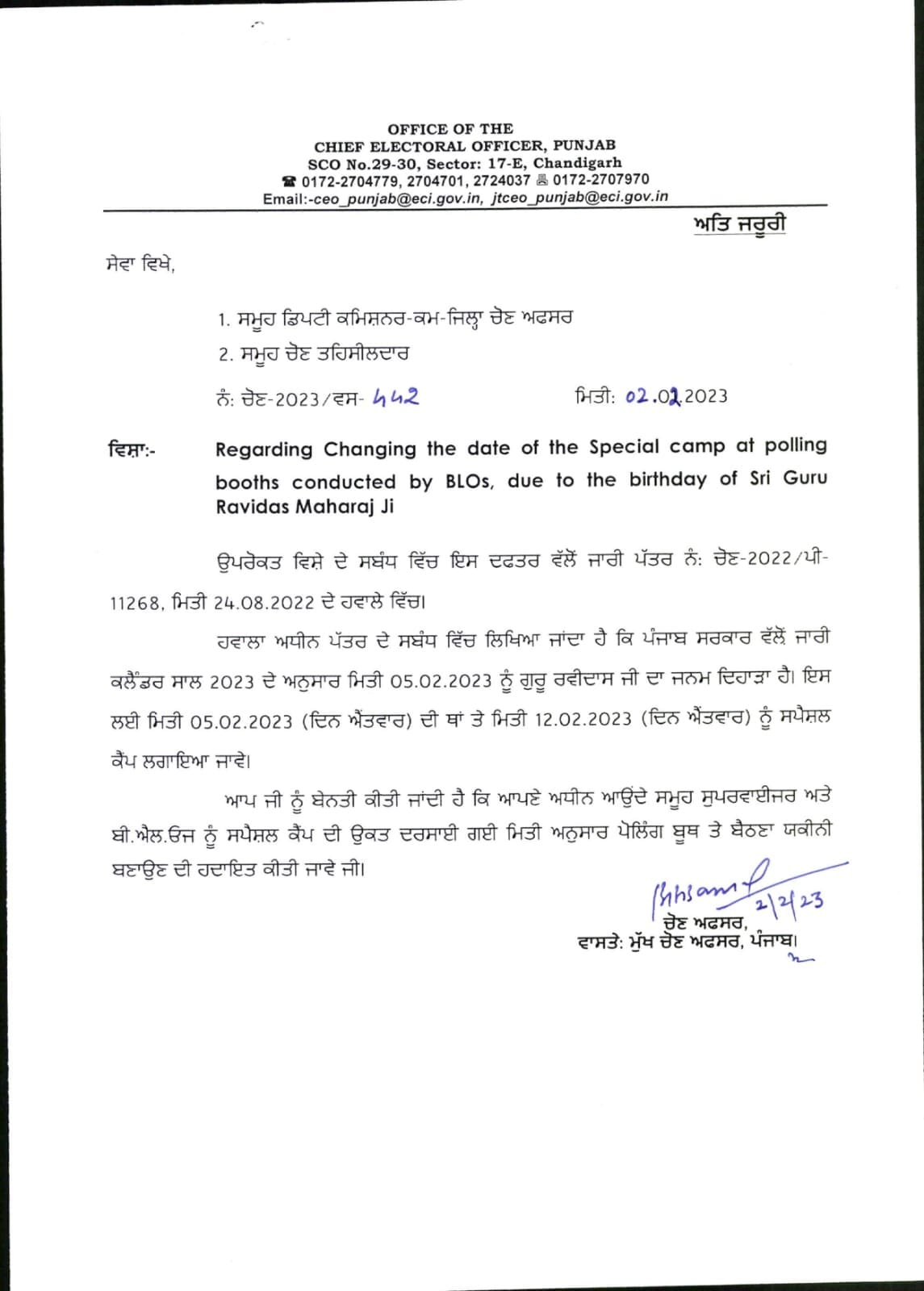 ਗੁਰਦਾਸਪੁਰ, 5 ਫਰਵਰੀ (ਸਰਬਜੀਤ ਸਿੰਘ)-ਮੁੱਖ ਚੋਣ ਅਫਸਰ ਪੰਜਾਬ ਨੇ ਇੱਕ ਪੱਤਰ ਜਾਰੀ ਕਰਕੇ ਪੰਜਾਬ ਦੇ ਸਮੂਹ ਡਿਪਟੀ ਕਮਿਸ਼ਨਰਾਂ-ਕਮ- ਜ਼ਿਲ੍ਹਾ ਚੋਣ ਅਫਸਰ, ਸਮੂਹ ਚੋਣ ਤਹਿਸੀਲਦਾਰਾਂ ਨੂੰ ਸੂਚਿਤ ਕੀਤਾ ਹੈ ਕਿ ਪੰਜਾਬ ਸਰਕਾਰ ਵੱਲੋਂ ਕਲੰਡਰ-2023 ਦੇ ਅਨੁਸਾਰ ਮਿਤੀ 5-2-2023 ਨੂੰ ਸ੍ਰੀ ਗੁਰੂ ਰਵੀਦਾਸ ਜੀ ਦਾ ਜਨਮ ਦਿਹਾੜਾ ਹੈ | ਇਸ ਲਈ ਉਸਦੀ ਜਗ੍ਹਾਂ ਮਿਤੀ 12-2-2023 ਨੂੰ ਦਿਨ੍ਹ ਐਤਵਾਰ ਵਿਸ਼ੇਸ਼ ਕੈਂਪ ਲਗਾਇਆ ਜਾਵੇਗਾ | ਇਸ ਵਿੱਚ ਸਬੰਧਤ ਕਰਮਚਾਰੀ ਅਤੇ ਪੋਲਿੰਗ ਬੂਥ ‘ਤੇ ਬੈਠਣਾ ਯਕੀਨੀ ਬਣਾਉਣ ਲਈ ਹਦਾਇਤਾਂ ਜਾਰੀ ਕੀਤੀਆਂ ਜਾਂਦੀਆਂ ਹਨ |