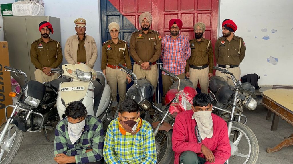 ਉਨਾਂ ਦੱਸਿਆ ਕਿ ਪੁਲਸ ਪਾਰਟੀ ਗਸ਼ਤ ਦੌਰਾਨ ਐੱਸ.ਡੀ.ਕਾਲਜ ਨੇੜੇ ਮੌਜੂਦ ਸੀ। ਇਸ ਦੌਰਾਨ ਮੁਖ਼ਬਰ ਨੇ ਇਤਲਾਹ ਦਿੱਤੀ ਕਿ ਮੁਲਜ਼ਮ ਤਿੱਬੜੀ ਚੌਕ ਤੋਂ ਐਸਡੀ ਕਾਲਜ ਵੱਲ ਚੋਰੀ ਦੇ ਵਾਹਨ ਲੈ ਕੇ ਆ ਰਹੇ ਹਨ। ਪੁਲੀਸ ਪਾਰਟੀ ਨੇ ਨਾਕਾਬੰਦੀ ਕਰਕੇ ਵਾਹਨਾਂ ਦੀ ਚੈਕਿੰਗ ਸ਼ੁਰੂ ਕਰ ਦਿੱਤੀ। ਇਸ ਦੌਰਾਨ ਤਿੰਨ ਨੌਜਵਾਨ ਦੋ ਮੋਟਰਸਾਈਕਲਾਂ ’ਤੇ ਆਉਂਦੇ ਦੇਖੇ ਗਏ। ਮੁਲਜ਼ਮਾਂ ਨੇ ਪੁਲੀਸ ਪਾਰਟੀ ਨੂੰ ਦੇਖ ਕੇ ਪਿੱਛੇ ਮੁੜਨ ਦੀ ਕੋਸ਼ਿਸ਼ ਕੀਤੀ ਪਰ ਮੌਕੇ ’ਤੇ ਹੀ ਕਾਬੂ ਕਰ ਲਿਆ ਗਿਆ। ਮੁਲਜ਼ਮ ਮੋਟਰਸਾਈਕਲ ਦੇ ਕੋਈ ਦਸਤਾਵੇਜ਼ ਨਹੀਂ ਦਿਖਾ ਸਕੇ। ਪੁਲਿਸ ਵੱਲੋਂ ਸਖ਼ਤੀ ਨਾਲ ਪੁੱਛਗਿੱਛ ਕਰਨ ‘ਤੇ ਉਨ੍ਹਾਂ ਦੱਸਿਆ ਕਿ ਉਹ ਚੋਰੀ ਦਾ ਮੋਟਰਸਾਈਕਲ ਕਿਸੇ ਨੂੰ ਵੇਚਣ ਜਾ ਰਹੇ ਸਨ | ਪੁਲੀਸ ਨੇ ਕੇਸ ਦਰਜ ਕਰਕੇ ਮੁਲਜ਼ਮਾਂ ਸੌਰਵ ਕੁਮਾਰ ਵਾਸੀ ਗੋਪਾਲ ਨਗਰ, ਧਾਰੀਵਾਲ, ਅਜੈ ਕੁਮਾਰ ਉਰਫ਼ ਮੁੰਨਾ ਵਾਸੀ ਧਾਰੀਵਾਲ ਅਤੇ ਸੰਦੀਪ ਵਾਸੀ ਅਵਾਂਖਾ, ਥਾਣਾ ਦੀਨਾਨਗਰ ਨੂੰ ਗ੍ਰਿਫ਼ਤਾਰ ਕਰ ਲਿਆ ਹੈ। ਬਾਅਦ ਵਿੱਚ ਮੁਲਜ਼ਮਾਂ ਦੀ ਨਿਸ਼ਾਨਦੇਹੀ ’ਤੇ ਦੋ ਹੋਰ ਚੋਰੀ ਦੇ ਮੋਟਰਸਾਈਕਲ ਅਤੇ ਇੱਕ ਸਕੂਟਰ ਬਰਾਮਦ ਕੀਤਾ ਗਿਆ।