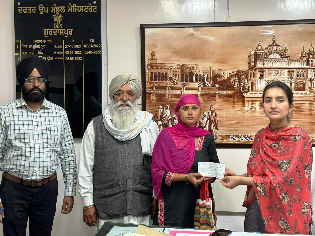 ਗੁਰਦਾਸਪੁਰ, 11 ਮਾਰਚ (ਸਰਬਜੀਤ ਸਿੰਘ) – ਬੀਤੇ ਸਮੇਂ ਖੇਤੀ ਕਾਨੂੰਨ ਦੇ ਵਿਰੁੱਧ ਦਿੱਲੀ ਵਿਖੇ ਲੱਗੇ ਕਿਸਾਨੀ ਧਰਨੇ ਦੌਰਾਨ ਪਿੰਡ ਤਲਵੰਡੀ ਲਾਲ ਸਿੰਘ, ਤਹਿਸੀਲ ਬਟਾਲਾ, ਜਿਲ੍ਹਾ ਗੁਰਦਾਸਪੁਰ ਦੀ ਖੇਤ ਮਜ਼ਦੂਰ ਬੀਬੀ ਸ਼ਰਨਜੀਤ ਕੌਰ ਦਾ ਦੇਹਾਂਤ ਹੋ ਗਿਆ ਸੀ। ਪੰਜਾਬ ਸਰਕਾਰ ਵੱਲੋਂ ਮ੍ਰਿਤਕ ਖੇਤ ਮਜ਼ਦੂਰ ਬੀਬੀ ਸ਼ਰਨਜੀਤ ਕੌਰ ਪਤਨੀ ਹਰਜੀਤ ਸਿੰਘ ਦੇ ਵਾਰਸਾਂ ਨਾਲ ਦੁੱਖ ਵੰਡਾਉਂਦਿਆਂ ਆਪਣੇ ਵਾਅਦੇ ਤਹਿਤ ਮ੍ਰਿਤਕ ਦੇ ਕਾਨੂੰਨੀ ਵਾਰਸਾਂ ਨੂੰ 5.00 ਲੱਖ ਰੁਪਏ ਮਾਲੀ ਸਹਾਇਤਾ ਭੇਜੀ ਗਈ ਹੈ। ਇਸ 5.00 ਲੱਖ ਰੁਪਏ ਦੀ ਮਾਲੀ ਸਹਾਇਤਾ ਦਾ ਚੈੱਕ ਅੱਜ ਐੱਸ.ਡੀ.ਐੱਮ. ਗੁਰਦਾਸਪੁਰ ਅਮਨਦੀਪ ਕੌਰ ਘੁੰਮਣ ਵੱਲੋਂ ਮ੍ਰਿਤਕ ਖੇਤ ਮਜ਼ਦੂਰ ਬੀਬੀ ਸ਼ਰਨਜੀਤ ਕੌਰ ਦੀ ਵਾਰਸ ਉਸਦੀ ਧੀ ਅਮਨਦੀਪ ਕੌਰ ਪਤਨੀ ਸੁਰਜੀਤ ਸਿੰਘ ਵਾਸੀ ਹਯਾਤ ਨਗਰ ਤਹਿਸੀਲ ਤੇ ਜ਼ਿਲ੍ਹਾ ਗੁਰਦਾਸਪੁਰ ਨੂੰ ਭੇਟ ਕੀਤਾ ਗਿਆ। ਐੱਸ.ਡੀ.ਐੱਮ. ਸ੍ਰੀਮਤੀ ਅਮਨਦੀਪ ਕੌਰ ਘੁੰਮਣ ਨੇ 5.00 ਲੱਖ ਰੁਪਏ ਦਾ ਚੈੱਕ ਭੇਟ ਕਰਦਿਆਂ ਕਿਹਾ ਕਿ ਪੰਜਾਬ ਸਰਕਾਰ ਤੇ ਜ਼ਿਲ੍ਹਾ ਪ੍ਰਸ਼ਾਸਨ ਨੂੰ ਪੀੜ੍ਹਤ ਪਰਿਵਾਰ ਨਾਲ ਪੂਰੀ ਹਮਦਰਦੀ ਹੈ।
