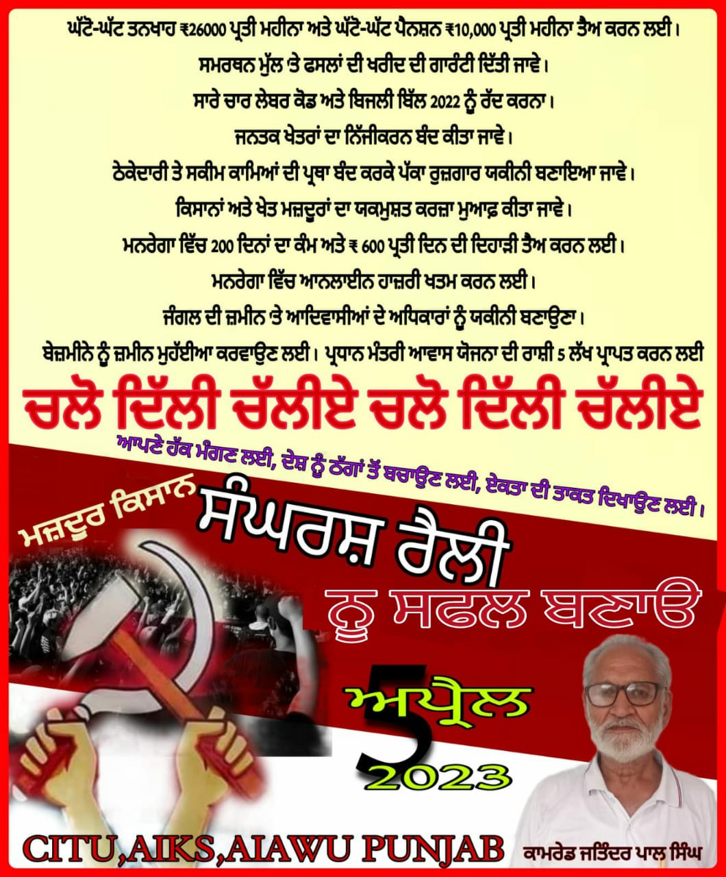 ਗੁਰਦਾਸਪੁਰ, 2 ਅਪ੍ਰੈਲ (ਸਰਬਜੀਤ ਸਿੰਘ)–ਸੀ.ਆਈ.ਟੀ.ਯੂ, ਏ.ਆਈ.ਕੇ.ਐਸ, ਏ.ਆਈ.ਡਬਲਯੂ.ਪੀ ਕਾਮਰੇਡ ਜਤਿੰਦਰ ਪਾਲ ਸਿੰਘ ਨੇ ਦੱਸਿਆ ਕਿ ਆਪਣੀ ਹੱਕੀ ਮੰਗਾਂ ਮੰਨਣ ਲਈ ਦੇਸ਼ ਨੂੰ ਠੱਗਾਂ ਤੋਂ ਬਚਾਉਣ ਲਈ,ਏਕਤਾ ਤਾਕਤ ਦਿਖਾਉਣ ਲਈ ਮਜਦੂਰ ਕਿਸਾਨ ਸੰਘਰਸ਼ ਰੈਲੀ ਨੂੰ ਪੂਰਨ ਤੌਰ ਤੇ ਸਫਲ ਬਣਾਉਣ ਲਈ 5 ਅਪ੍ਰੈਲ ਨੂੰ ਦਿੱਲੀ ਚੱਲੀਏ, ਚੱਲੋ ਦਿੱਲੀ ਚੱਲੀਏ ਦੇ ਨਾਮ ਤੇ ਇੱਕ ਸੰਘਰਸ਼ ਵਿੱਢਿਆ ਜਾਵੇਗਾ। ਜਿਸ ਵਿੱਚ ਮੁੱਖ ਮੰਗਾਂ ਕਿ ਘੱਟੋ ਘੱਟ ਤਨਖਾਹ 26 ਹਜਾਰ ਰੂਪਏ ਪ੍ਰਤੀ ਮਹੀਨਾ ਅਤੇ ਪੈਨਸ਼ਨ 10 ਹਜਾਰ ਰੂਪਏ ਪ੍ਰਤੀ ਮਹੀਨਾ ਤੈਅ ਕਰਨ ਲਈ ਸਮਰਨਥ ਮੁੱਲ ਤੇ ਖਰੀਦ ਦੀ ਗਾਰੰਟੀ ਦਿੱਤੀ ਜਾਵੇ। ਇਸ ਤੋਂ ਇਲਾਵਾ ਸਾਰੇ ਚਾਰ ਲੈਬਰ ਕੋਡ, ਬਿਜਲੀ ਬਿੱਲ ਨੂੰ 2022 ਤੋਂ ਰੱਦ ਕਰਨਾ, ਜਨਤਕ ਖੇਤਰਾਂ ਦਾ ਨਿੱਜੀਕਰਨ ਬੰਦ ਕੀਤਾ ਜਾਵੇ। ਠੇਕੇਦਾਰ ਤੇ ਸਕੀਮ ਕਾਮੇ ਦੀ ਪ੍ਰਥਾ ਬੰਦ ਕਰਕੇ ਪੱਕਾ ਰੋਜਗਾਰ ਯਕੀਨੀ ਬਣਾਇਆ ਜਾਵੇ। ਕਿਸਾਨ ਅਤੇ ਖੇਤ ਮਜਦੂਰ ਦਾ ਯਕਮੁਸ਼ਤ ਕਰਜਾ ਮੁਆਫ ਕੀਤਾ ਜਾਵੇ। ਮਨਰੇਗਾ ਵਿੱਚ 200 ਦਿਨ੍ਹਾਂ ਦਾ ਕੰਮ ਅਤੇ 600 ਰੁਪਏ ਪ੍ਰਤੀ ਦਿਹਾੜੀ ਕਰਨ ਲਈ ਮਨਰੇਗਾ ਵਿੱਚ ਆਨਲਾਈਨ ਹਾਜਰੀ ਖਤਮ ਕੀਤੀ ਜਾਵੇ। ਜੰਗਲ ਦੀ ਜਮੀਨ ਤੇ ਆਦੀਵਾਸ਼ੀਆ ਦੇ ਅਧਿਕਾਰ ਨੂੰ ਯਕੀਨੀ ਬਣਾਇਆ ਜਾਵੇ। ਇਸ ਤੋ ਇਲਾਵਾ ਬੇਜਮੀਨਾਂ ਲੋਕਾਂ ਨੂੰ ਜਮੀਨ ਮੁਹੱਈਆ ਕਰਵਾਉਣ ਲਈ ਪ੍ਰਧਾਨ ਮੰਤਰੀ ਆਵਾਜ ਯੋਜਨਾ ਦੀ ਰਾਸ਼ੀ 5 ਲੱਖ ਪ੍ਰਾਪਤ ਕਰਨ ਲਈ ਨਿਯਮ ਜਾਰੀ ਕੀਤੇ ਜਾਣ।
