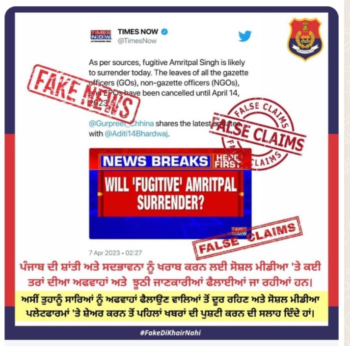 ਪੰਜਾਬ ਦੇ ਡੀ.ਜੀ.ਪੀ ਗੌਰਵ ਯਾਦਵ ਨੇ ਪੰਜਾਬ ਦੇ ਲੋਕਾਂ ਨੂੰ ਗਲਤ ਖਬਰਾਂ ਸੂਚੇਤ ਰਹਿਣ ਦੀ ਕੀਤੀ ਅਪੀਲ ਪੰਜਾਬ April 8, 2023April 8, 2023josh newsLeave a Comment on ਪੰਜਾਬ ਦੇ ਡੀ.ਜੀ.ਪੀ ਗੌਰਵ ਯਾਦਵ ਨੇ ਪੰਜਾਬ ਦੇ ਲੋਕਾਂ ਨੂੰ ਗਲਤ ਖਬਰਾਂ ਸੂਚੇਤ ਰਹਿਣ ਦੀ ਕੀਤੀ ਅਪੀਲ ਗੁਰਦਾਸਪੁਰ, 8 ਅਪ੍ਰੈਲ (ਸਰਬਜੀਤ ਸਿੰਘ)—ਪੰਜਾਬ ਦੇ ਡੀ.ਜੀ.ਪੀ ਗੌਰਵ ਯਾਦਵ ਨੇ ਪੰਜਾਬ ਦੇ ਲੋਕਾਂ ਨੂੰ ਗਲਤ ਖਬਰਾਂ ਸੂਚੇਤ ਰਹਿਣ ਜਿਵੇਂ ਕਿ ਹੇਠ ਲਿਖੇ ਅਨੁਸਾਰ ਪ੍ਰਕਾਸ਼ਿਤ ਕੀਤੀਆਂ ਗਈਆਂ ਖਬਰਾਂ ਤੱਥਾ ਦੇ ਆਧਾਰ ਤੇ ਨਹੀੰ ਅਤੇ ਬੇਬੁਨਿਆਦ ਹਨ।