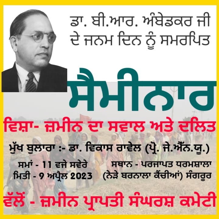 ਸੰਗਰੂਰ, ਗੁਰਦਾਸਪੁਰ, 8 ਅਪ੍ਰੈਲ (ਸਰਬਜੀਤ ਸਿੰਘ)–ਡਾ. ਬੀ.ਆਰ ਅੰਬੇਡਕਰ ਦੇ ਜਨਮ ਦਿਨ੍ਹ ਨੂੰ ਸਮਰਪਿਤ ਇੱਕ ਸੈਮੀਨਾਰ ਕਰਵਾਇਆ ਜਾ ਰਿਹਾ ਹੈ। ਜਿਸਦਾ ਏਜੰਡਾ ਹੈ ਕਿ ਜਮੀਨ ਦਾ ਸਵਾਲ ਅਤੇ ਦਲਿਤ ਹੈ। ਜਿਸ ਵਿੱਚ ਜਮੀਨ ਪ੍ਰਾਪਤੀ ਸੰਘਰਸ਼ ਕਮੇਟੀ ਦੇ ਮੁੱਖ ਬੁਲਾਰੇ ਡਾ. ਵਿਕਾਸ ਰਵੇਲ (ਪ੍ਰੋ. ਜੇ.ਐਨ.ਯੂ) ਵਿਸ਼ੇਸ਼ ਤੌਰ ਤੇ ਸ਼ਮੂਲੀਅਤ ਕਰ ਰਹੇ ਹਨ। ਇਹ ਸੈਮੀਨਾਰ ਪ੍ਰਜਾਪਤ ਧਰਮਸ਼ਾਲਾ ਨੇੜੇ ਬਰਨਾਲਾ ਕੈਂਚੀਆ ਸੰਗਰੂਰ ਵਿਖੇ 9 ਅਪ੍ਰੈਲ ਨੂੰ ਕਰਵਾਇਆ ਜਾ ਰਿਹਾ ਹੈ।ਜਿਸ ਵਿੱਚ ਇਲਾਕੇ ਦੇ ਬੁੱਧੀਜੀਵੀ ਸ਼ਿਰਕਤ ਕਰਨਗੇ।