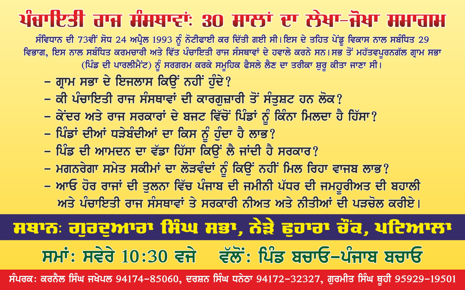ਪਟਿਆਲਾ, ਗੁਰਦਾਸਪੁਰ, 18 ਅਪ੍ਰੈਲ (ਸਰਬਜੀਤ ਸਿੰਘ)–ਪੰਚਾਇਤੀ ਰਾਜ ਸੰਸਥਾਵਾਂ 30 ਸਾਲਾਂ ਦਾ ਲੇਖਾ ਜੋਖਾ ਸਮਾਗਮ 24 ਅਪ੍ਰੈਲ ਨੂੰ ਗੁਰਦੁਆਰਾ ਸਿੰਘ ਸਬਾ ਨੇੜੇ ਛੁਹਾਰਾ ਚੌਂਕ ਪਟਿਆਲਾ ਵਿਖੇ ਕਰਵਾਇਆ ਜਾ ਰਿਹਾ ਹੈ |