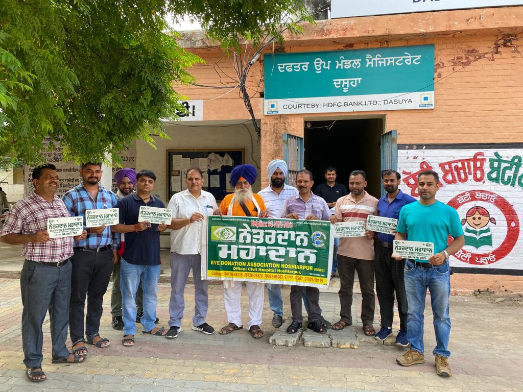 ਗੁਰਦਾਸਪੁਰ, 7 ਜੁਲਾਈ (ਸਰਬਜੀਤ ਸਿੰਘ)–ਅੱਜ ਦੀ ਸੰਸਾਰ ਵਿੱਚ ਲੱਖਾਂ ਲੋਕ ਅੱਖਾਂ ਦੀ ਰੋਸ਼ਨੀ ਨਾ ਹੋਣ ਕਰਕੇ ਹਨੇਰੀ ਦੁਨੀਆ ਵਿੱਚ ਜਿਉਣ ਲਈ ਮਜਬੂਰ ਹਨ। ਅਸੀ ਆਪਣੀ ਅੱਖਾਂ ਨੂੰ ਜੀਵਨ ਦੇ ਬਾਅਦ ਵੀ ਸੁਰੱਖਿਤ ਰਹਿਣ ਦਈਏ। ਅੱਜ ਵੀ ਮੁੱਖ ਲੋੜ ਹੈ। ਇਨ੍ਹਾਂ ਸ਼ਬਦਾ ਦਾ ਪ੍ਰਗਟਾਵਾ ਭਾਈ ਬਰਿੰਦਰ ਸਿੰਘ ਮਸੀਤੀ ਵੱਲੋਂ ਦਫਤਰ ਉਪ ਮੰਡਲ ਮੈਜਿਸਟਰੇਟ, ਦਸੂਹਾ, ਸੁਪਰਡੈਂਟ ਸੰਜੀਵ ਕੁਮਾਰ, ਰਾਜੇਸ਼ ਕੁਮਾਰ ਰੀਡਰ, ਭੁਪਿੰਦਰ ਸਿੰਘ ਸਟੈਨੋ, ਹਰਜੀਤ ਸਿੰਘ ਫੁਟਕਲ ਕਲਰਕ, ਮਨਪ੍ਰੀਤ ਸਿੰਘ ਅਹਿਲਮਦ, ਸੰਦੀਪ ਸਿੰਘ ਫੁਟਕਲ ਅਤੇ ਬਾਕੀ ਸਟਾਫ ਨਾਲ,ਮਰਨ ਤੋਂ ਬਾਅਦ ਅੱਖਾਂ ਦਾਨ, ਸ਼ਰੀਰ ਦਾਨ ਤੇ ਅੰਗਦਾਨ ਕਰਨ ਸਬੰਧੀ ਜਾਗਰੂਕਤਾ ਫੈਲਾਈ। ਸਮੂਹ ਸਟਾਫ ਵੱਲੋਂ ਜਿਲ੍ਹਾ ਹੁਸ਼ਿਆਰਪੁਰ ਵੱਧ ਪ੍ਰਚਾਰ ਕਰ ਭਾਈ ਬਰਿੰਦਰ ਸਿੰਘ ਮਸੀਤੀ ਜੋ ਸਾਈਕਲ ਤੇ ਯਾਤਰਾ ਕਰਨ ਦੇ ਮਿਸ਼ਨ ਦੀ ਸ਼ਲਾਘਾ ਕੀਤੀ।